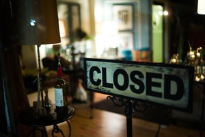 A rustic 'CLOSED' sign stands prominently in the foreground, casting a sense of finality over the softly lit interior beyond. The warm glow from lamps and scattered furnishings creates an inviting yet deserted atmosphere, evoking feelings of solitude. The composition draws the viewer's eye toward the blurred yet inviting hints of life behind the glass, contrasting with the stark message of closure.