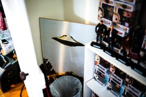 In a cluttered corner, a large image of a UFO looms over a simple trash can, casting a surreal juxtaposition against a backdrop of colorful collectibles. The soft lighting subtly highlights the random assortment of figures and items, creating a whimsical yet mysterious atmosphere. This composition invites curiosity about the stories and fantasies entwined in the ordinary chaos.