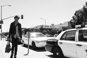In a bustling cityscape captured in black and white, a lone figure strides confidently along the sidewalk, carrying a bag and donning stylish attire that contrasts with the stark surroundings. The bright daylight casts sharp shadows, highlighting the tension between urban life and personal journey, while the presence of parked police cars adds a hint of underlying unease. The composition draws the viewer's eye towards the subject, evoking a strong sense of individuality amidst the crowded streets.