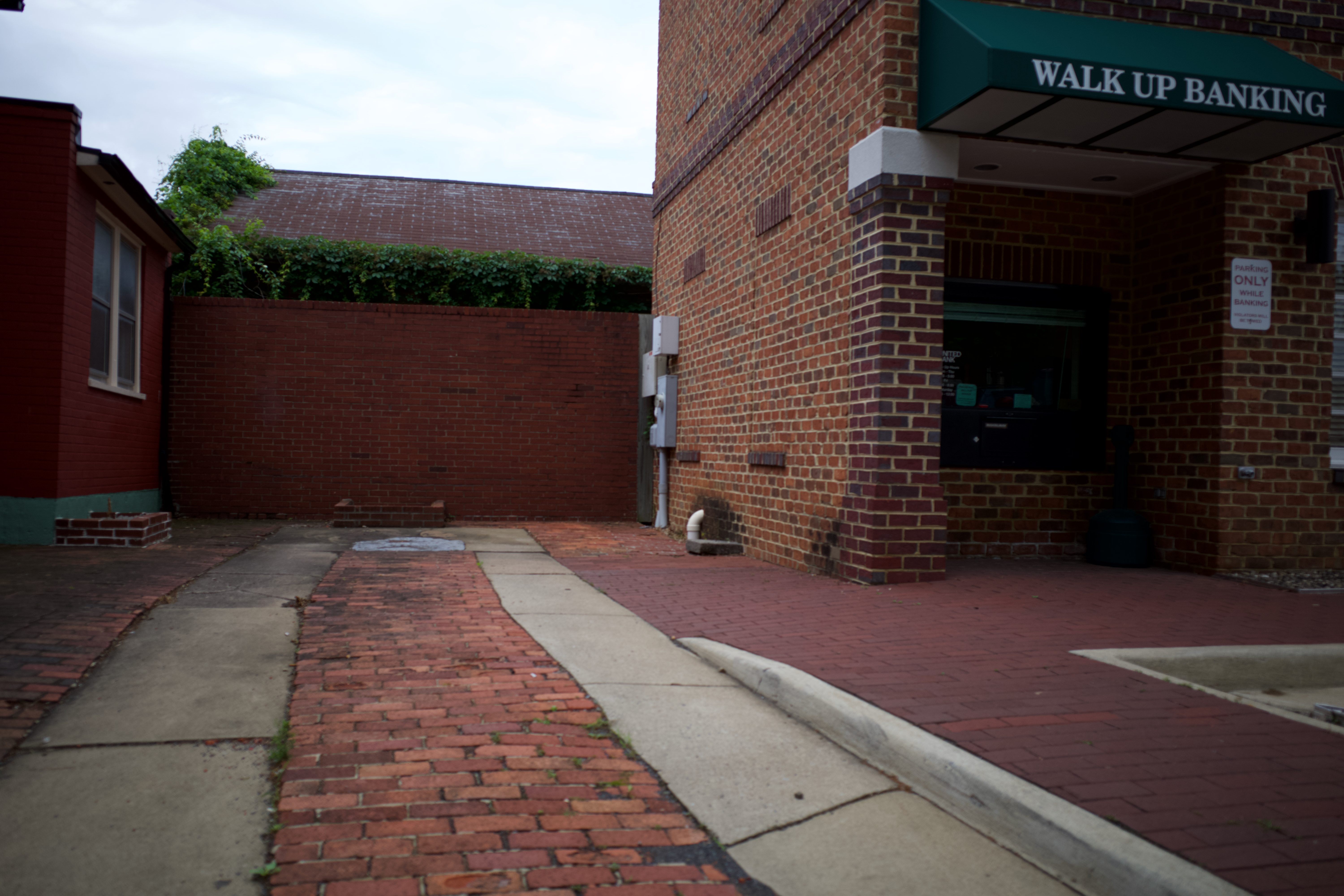 This photograph captures a quiet alleyway behind a brick building, contrasting the structured architecture of the bank with the organic presence of a lone cat. The muted lighting evokes a sense of solitude, while the arrangement of bricks and pathways leads the eye through a secluded space, highlighting the interplay between urban life and hidden corners. A sense of calm permeates the scene, inviting viewers to contemplate the often-overlooked details of everyday environments.