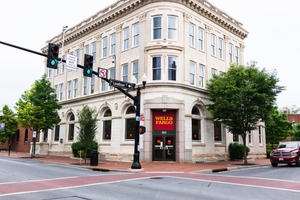 This photograph captures a historic Wells Fargo building at the intersection of Loudoun Street on a cloudy day. The muted lighting enhances the elegant architectural details, while surrounding greenery adds a touch of life to the urban scene. The composition draws the eye to the prominent bank signage, grounding the image in a sense of place and purpose.
