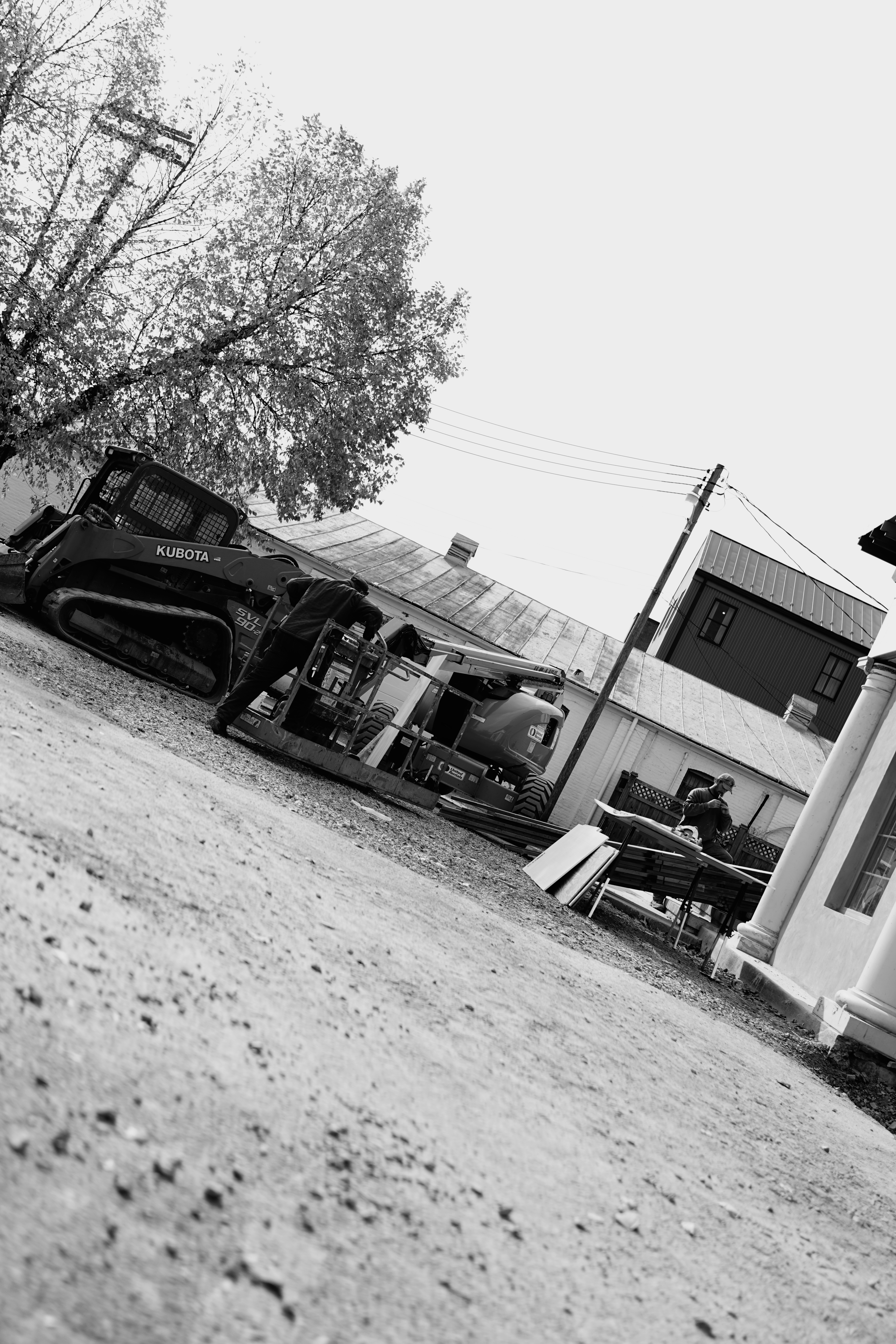 This photograph captures a moment on a construction site, where heavy machinery sits idle against a backdrop of rustic buildings and trees. The monochrome tones reflect a serene yet industrious atmosphere, with contrasting textures highlighting the ruggedness of the equipment and the delicate foliage above. The low perspective invites the viewer into the scene, adding depth and emphasizing the quiet anticipation of work yet to come.