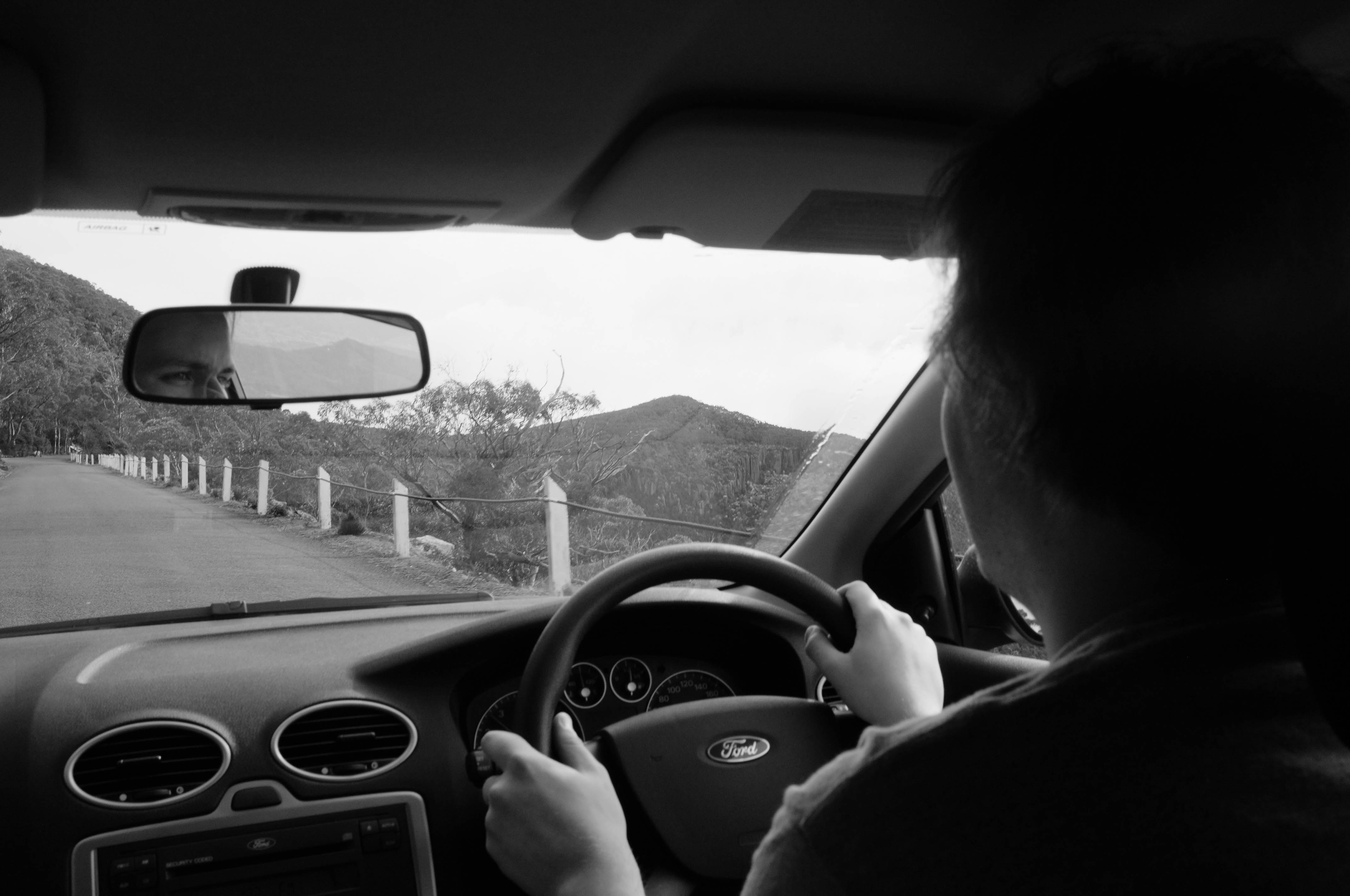 The photograph captures a driver in a contemplative moment, hands firmly gripping the steering wheel as they traverse a winding road flanked by lush hills. The monochrome tone enhances the mood of introspection, while the mirror reflects an enigmatic gaze, suggesting uncertain thoughts or memories. The composition draws the eye from the driver's focus to the open road ahead, evoking a sense of adventure and solitude.