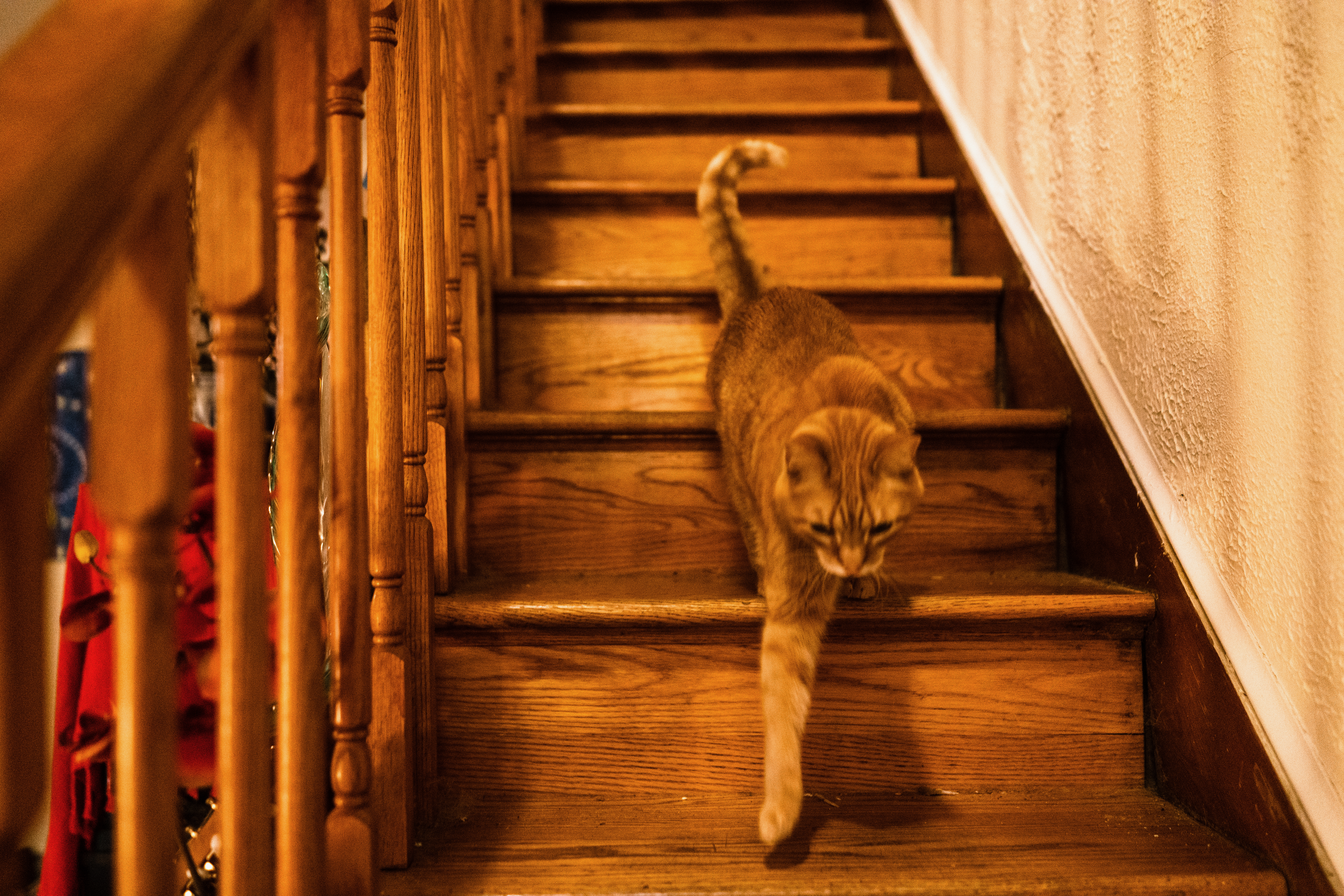 An orange cat confidently descends a warm, wooden staircase, its soft fur contrasting beautifully with the rich tones of the polished steps. The ambient lighting casts a cozy glow, enhancing the inviting atmosphere of the home. The composition draws the eye downward, emphasizing both the cat's graceful movement and the charming details of the surrounding staircase.