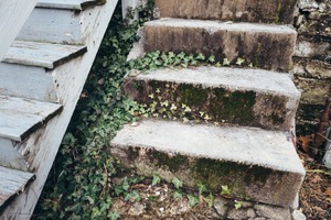 The photograph captures a weathered set of concrete stairs, partially hidden by creeping ivy and moss, suggesting a forgotten pathway entangled with nature. Soft, diffused lighting enhances the muted tones of the stone and foliage, creating a serene yet slightly melancholic atmosphere. The composition emphasizes the interplay between manmade structure and organic growth, evoking a sense of time passing and the resilience of nature.