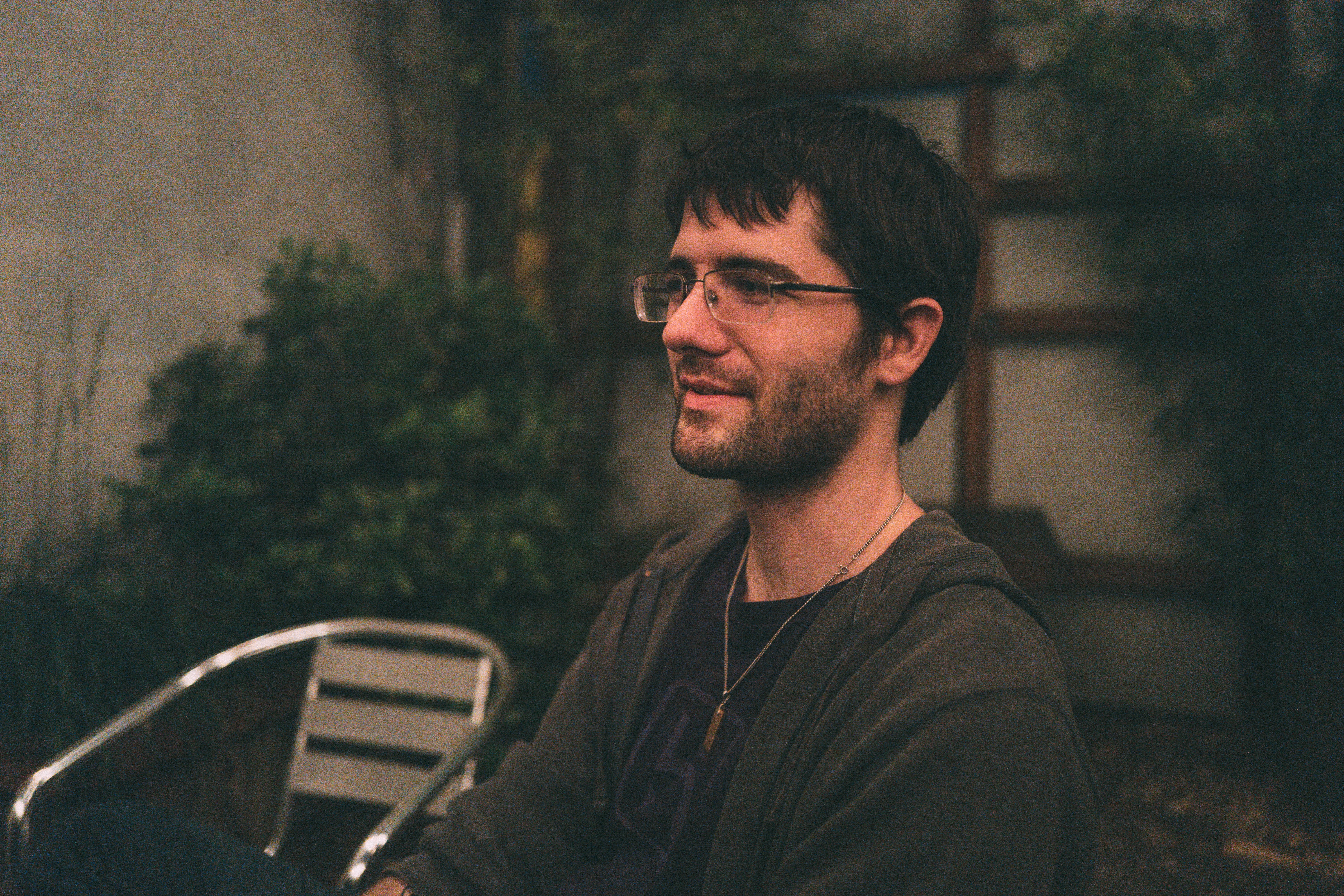 A young man sits casually, lost in thought while framed by soft, ambient lighting. The warm tones of the surroundings contrast with his relaxed demeanor, creating an intimate atmosphere perfect for candid reflection. The slightly blurred background enhances the focus on the subject, inviting viewers into a moment of quiet contemplation.