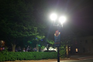 The photograph captures a serene night scene, illuminated by a vintage street lamp that casts a warm glow over the surroundings. The lush greenery and shadowy outlines of nearby trees enhance the composition, creating a sense of tranquility amidst the urban setting. The interplay of light and darkness evokes a peaceful, contemplative mood, inviting the viewer to linger in the calm of the night.