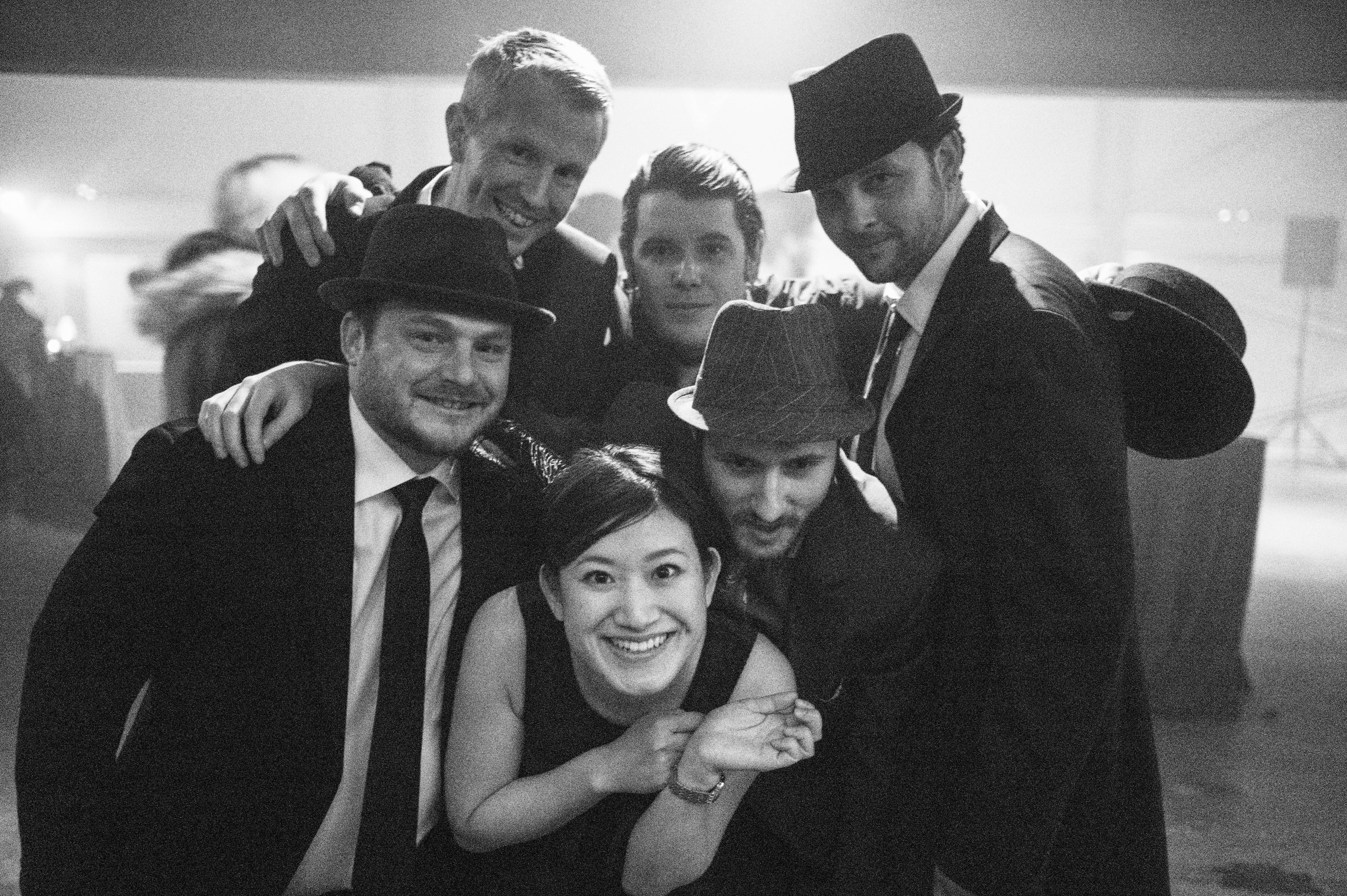In a black and white photograph, a group of five men and one woman radiate joy and camaraderie, dressed in stylish attire and hats. The soft lighting casts a warm glow, enhancing the intimate atmosphere, while their playful poses convey a sense of celebration and connection. The composition brings the subjects together in a tight frame, emphasizing their smiles and the shared joyous moment amidst a blurred background.