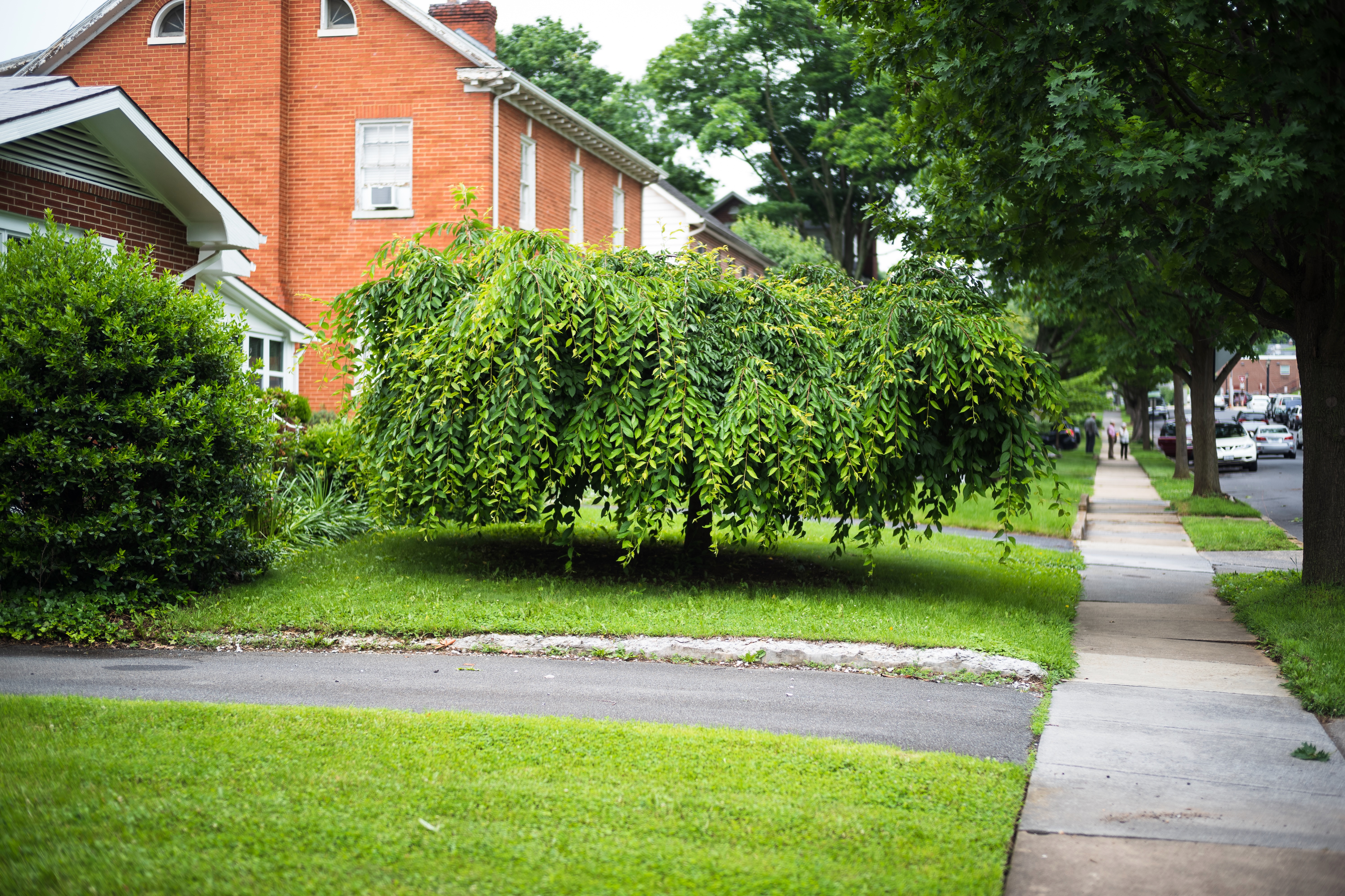 This photograph features a vibrant, leafy tree dominating a suburban sidewalk scene, embodying a sense of tranquility amidst urban life. The lush greenery contrasts beautifully with the rustic brick facade of the nearby house, while the soft diffused light creates an inviting atmosphere. The composition leads the viewer's eye along the path, inviting exploration of this serene neighborhood.