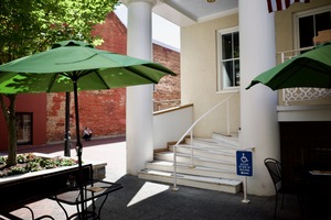 This photograph captures a quaint outdoor cafe scene, framed by lush green umbrellas that invite relaxation. The contrast between the vibrant greenery and the warm, sunlit walls creates a soothing atmosphere, while a subtle texture of the aged brick in the background adds depth. The composition, with its gentle curves and accessible stairway, evokes a sense of welcoming tranquility in an everyday moment.