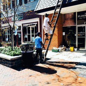 In a vibrant urban scene, two workers engage in a renovation, one climbing a wooden ladder while the other supports him from below. The mood is industrious yet relaxed, accentuated by warm sunlight filtering through the trees and casting long shadows on the brick pavement. The composition captures the harmony of teamwork amidst a backdrop of quaint storefronts and a bustling neighborhood.