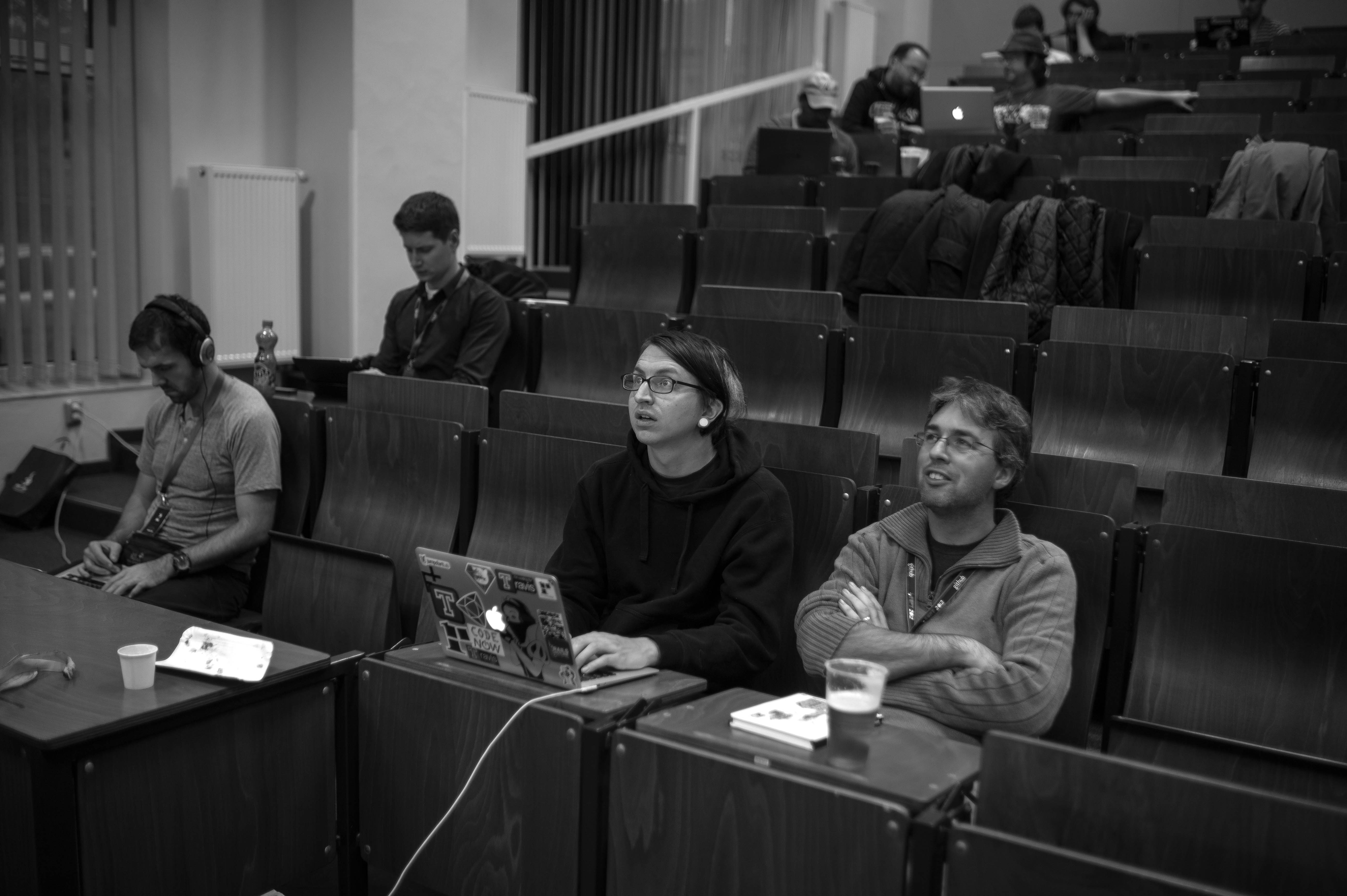 In a dimly lit auditorium, a group of individuals sit absorbed in their screens, each lost in their own world. The contrasting expressions of concentration and casual engagement create a subtle tension, enhanced by the monochrome palette that emphasizes the mood of quiet study. The composition highlights the emptiness of the rows, reflecting a sense of solitude amidst the shared space.
