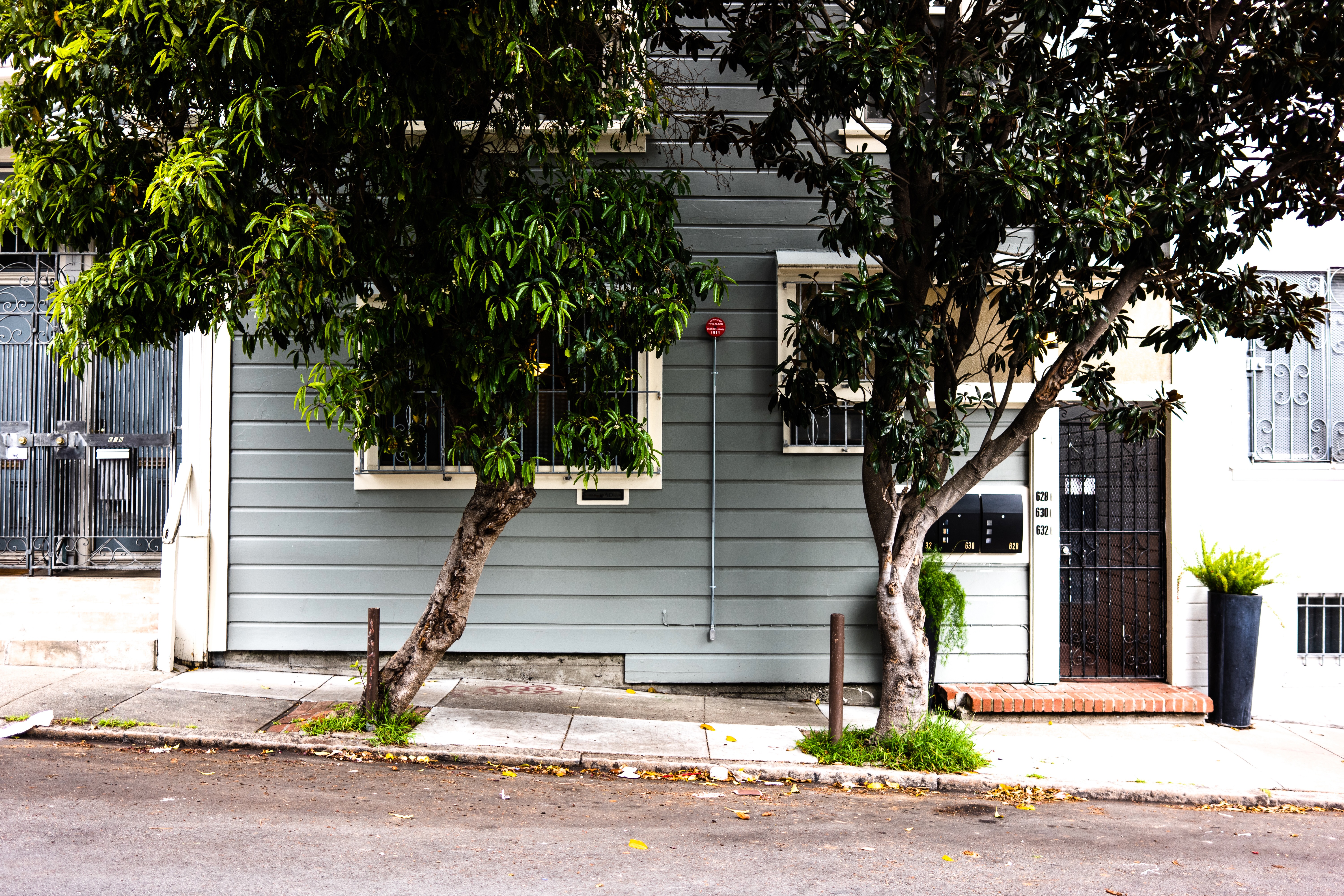 This photograph captures a calm, urban scene featuring a muted blue-gray house framed by two lush trees. The muted sunlight streams through the leaves, creating a soft, inviting ambiance that contrasts with the structured elements of the street and metal gate. The composition draws the eye toward the inviting doorway, blending natural and architectural beauty harmoniously.