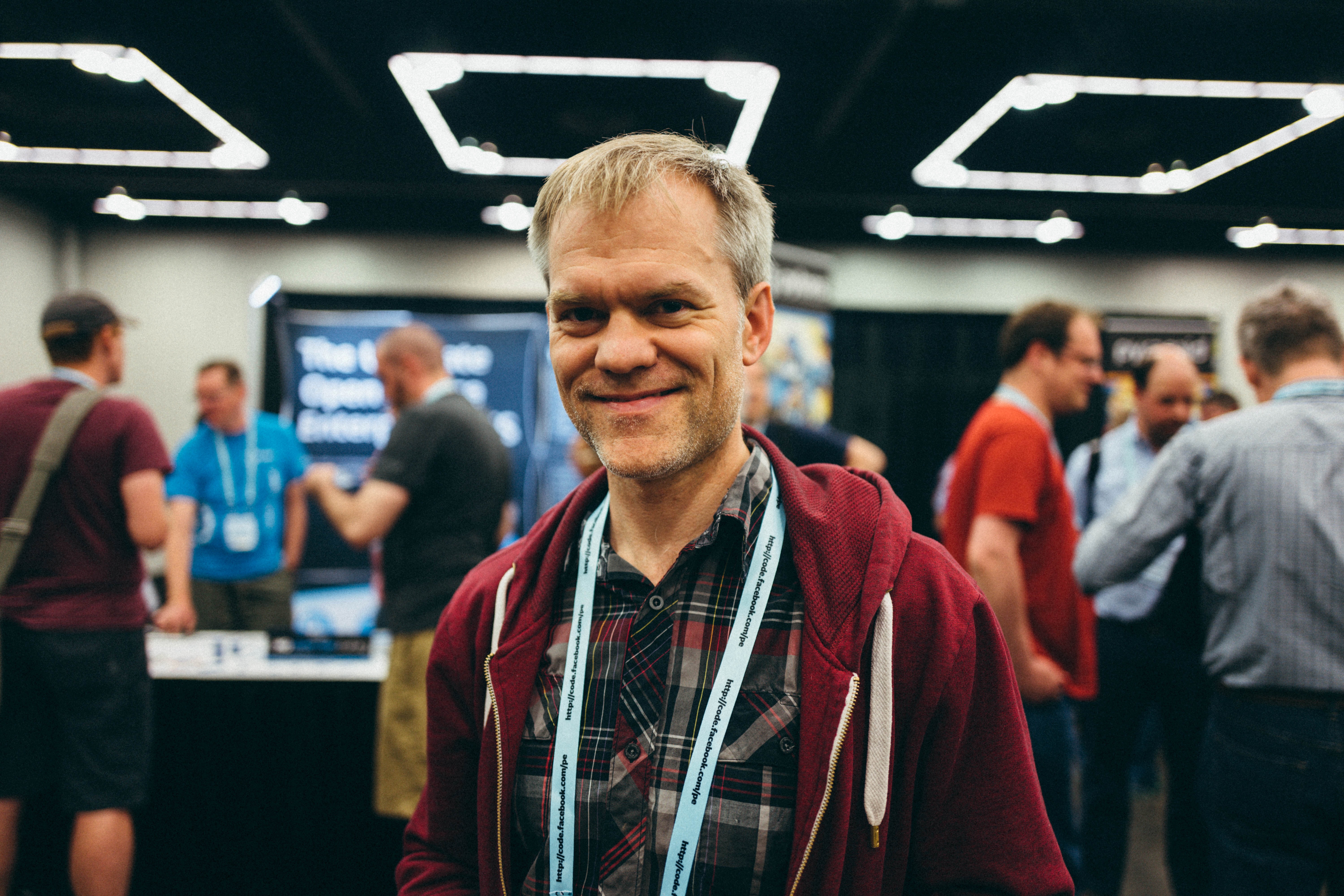 In this candid shot, a cheerful individual in a maroon hoodie stands out against a bustling conference backdrop, exuding warmth and approachability. The soft, diffused lighting creates an inviting atmosphere, accentuating the subject's genuine smile amidst a lively crowd engaged in conversation. The composition balances foreground and background elements, drawing attention to both the individual and the dynamic surroundings of the event.