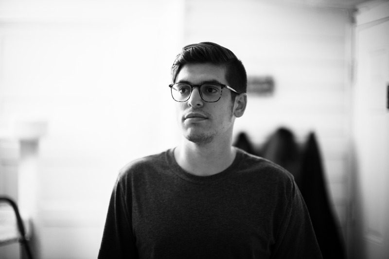 The photograph captures a young man standing against a softly blurred background, exuding a mood of quiet introspection. The high-contrast black and white tones highlight his thoughtful expression and the sharp lines of his glasses, while soft, diffused lighting creates a serene atmosphere. The composition draws the viewer's eye to his face, inviting reflection and connection.