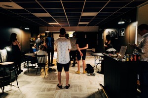 The photograph captures a group of people standing in a dimly lit room, their backs to the viewer, creating an atmosphere of curiosity and anticipation. The soft lighting highlights the contrasts of the dark walls and the light-colored flooring, guiding the eye toward an illuminated doorway, suggesting something significant awaits beyond. This composition, with its blend of shadows and subtle light, evokes a sense of shared experience amidst individual contemplation.