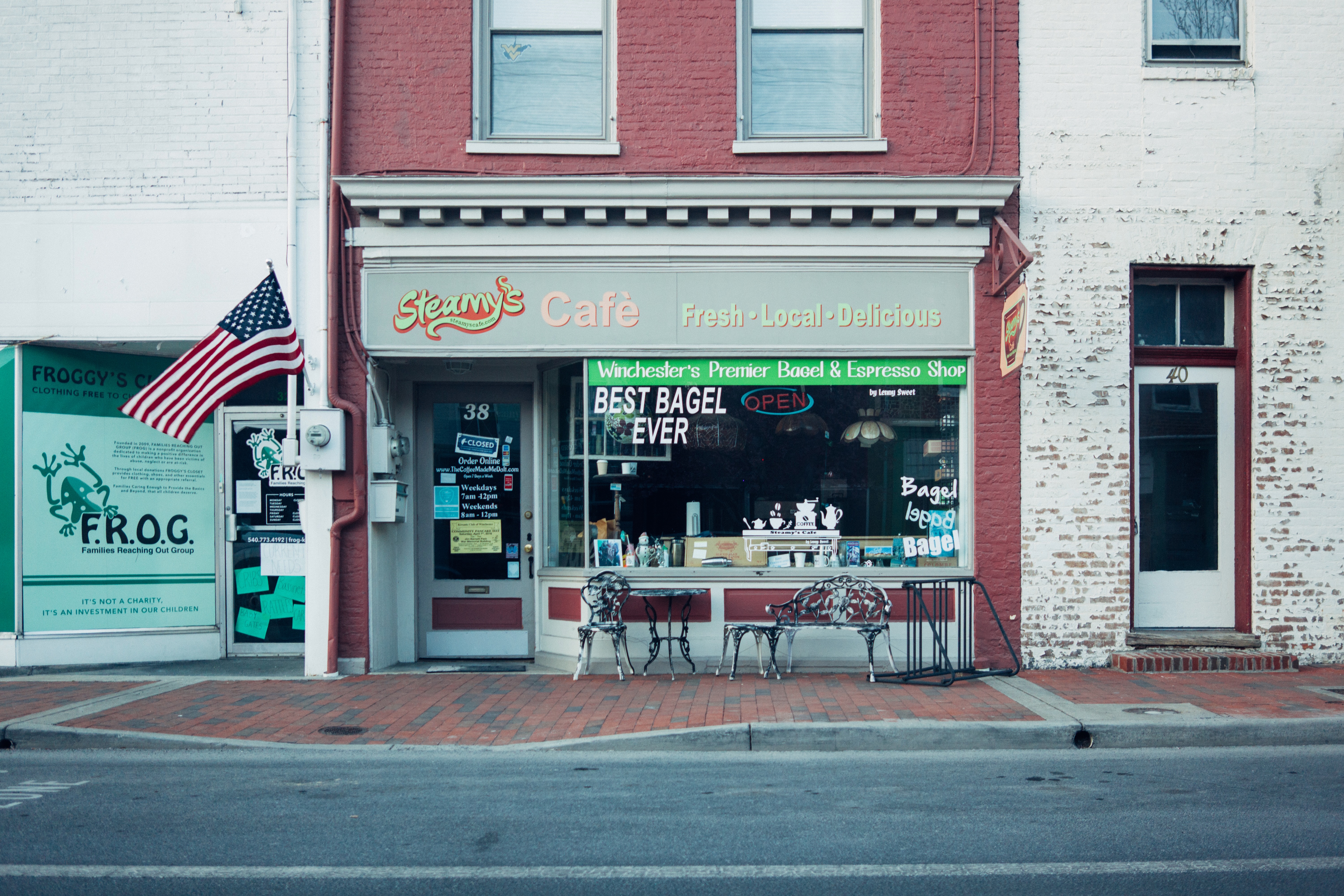 The photograph captures the inviting exterior of Steamy's Cafe, a quaint spot that beckons with its colorful signage and outdoor seating. The American flag adds a touch of patriotism, while the soft lighting enhances the cozy atmosphere, suggesting a peaceful morning vibe. The composition contrasts textured brick walls with a cheerful cafe front, portraying a charming neighborhood scene.