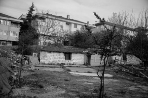 This monochrome photograph captures a stark contrast between an old, humble dwelling and the modern buildings looming in the background. The overcast sky casts a somber mood over the scene, highlighting the textures of decaying structures and sparse vegetation. Shadows play along the ground, enhancing the feeling of isolation in this quiet urban enclave.