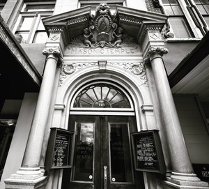 The photograph captures the grand entrance of a Masonic Temple, showcasing intricate architectural details framed in monochrome. The dramatic lighting accentuates the ornate carvings and columns, evoking a sense of history and intrigue. A hint of mystery pervades the scene, inviting viewers to ponder the stories held within these walls.