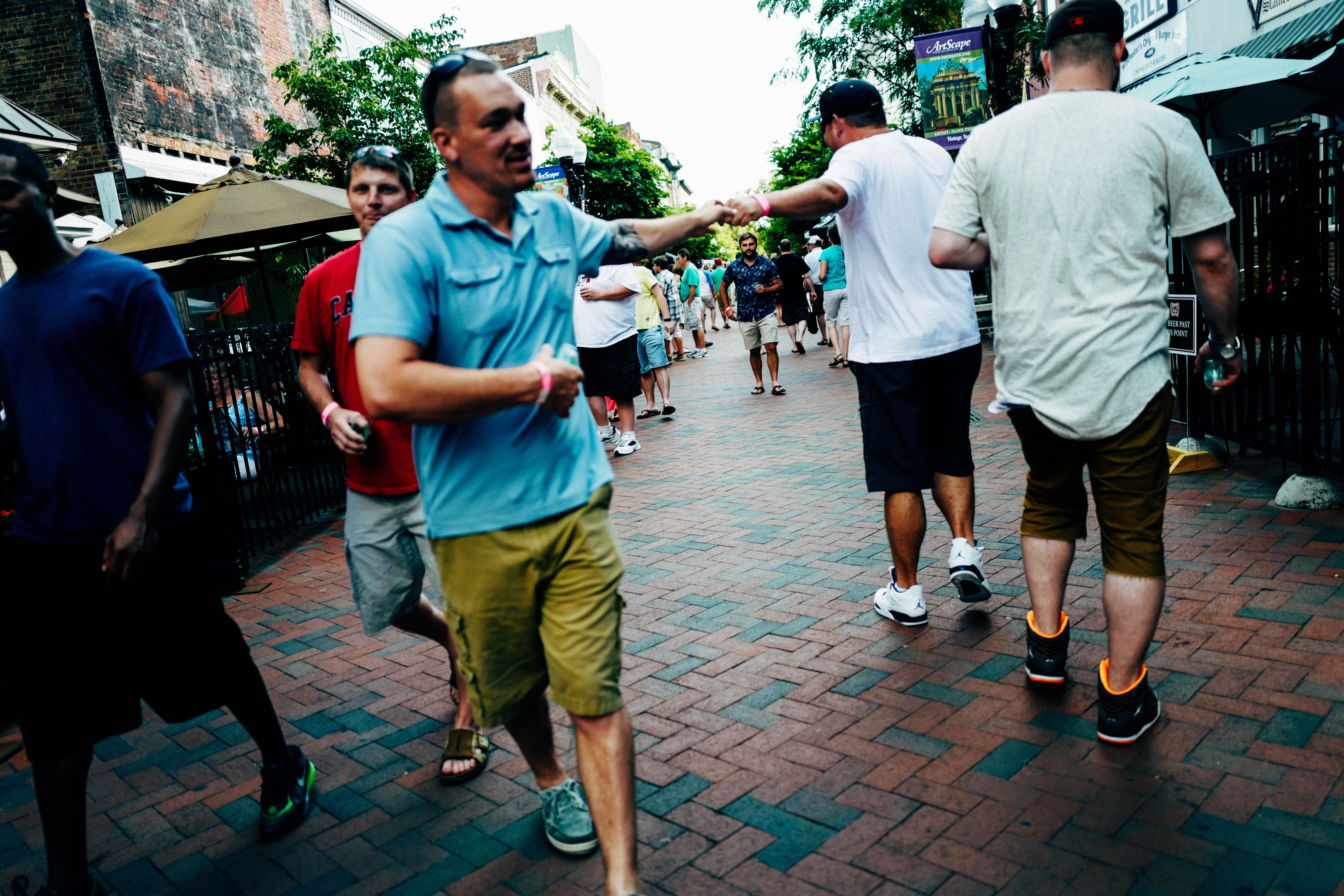 This lively photograph captures a bustling street scene filled with people enjoying a sunny day. The central focus is on two men engaged in a friendly handshake, conveying a sense of camaraderie amidst the casual atmosphere. The warm, diffused lighting enhances the inviting mood, while the vibrant colors of the clothing and the patterned brick road add a dynamic touch to the composition.