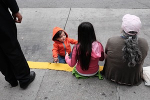 In a candid urban scene, a cheerful toddler in a bright orange hoodie engages with a young girl sitting beside him, both framed by two adults in muted tones, emphasizing their protective presence. The soft daylight casts gentle shadows, creating a warm and inviting atmosphere despite the city’s hustle. The composition highlights the simplicity of their interaction, evoking a sense of familial love and innocence amidst the urban backdrop.