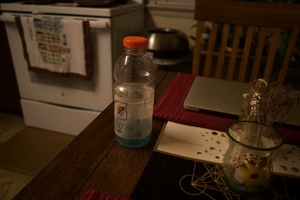 A Gatorade bottle sits prominently on a wooden table, illuminated by soft, warm light. The surrounding kitchen hints at a lived-in space, with elements like a covered pot and a laptop subtly blurred in the background, creating a serene and intimate mood. The contrasting textures of the tableware and the soft glow of the candle add to the photograph's cozy atmosphere.