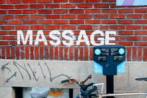 This photograph captures a striking juxtaposition between a bold 'MASSAGE' sign and a mundane parking meter, set against a backdrop of warm, textured red bricks. The composition draws the eye upwards, suggesting a narrative of relaxation amidst the bustling city life. Soft, natural lighting enhances the earthy tones, imbuing the scene with an inviting yet gritty urban charm.