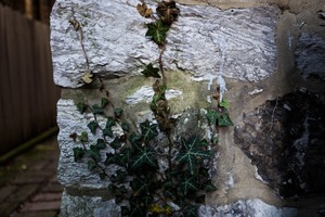 This photograph captures the intricate dance of ivy as it climbs and entwines around a weathered stone wall, showcasing both resilience and decay. The interplay of shadows and soft light brings a serene yet contemplative mood to the scene, highlighting the textures of the stone and the vibrant greens of the leaves. The composition invites the viewer to appreciate the beauty of nature reclaiming a man-made structure.