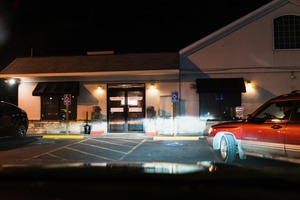This photograph captures a closed establishment under the hush of night, exuding a sense of calm and isolation. The warm yellow lights illuminate the entrance, creating a contrast against the cool, dark surroundings, while parked vehicles add a subtle touch of life to the scene. The composition draws the eye to the inviting yet unoccupied doorway, enhancing the mood of stillness and anticipation.