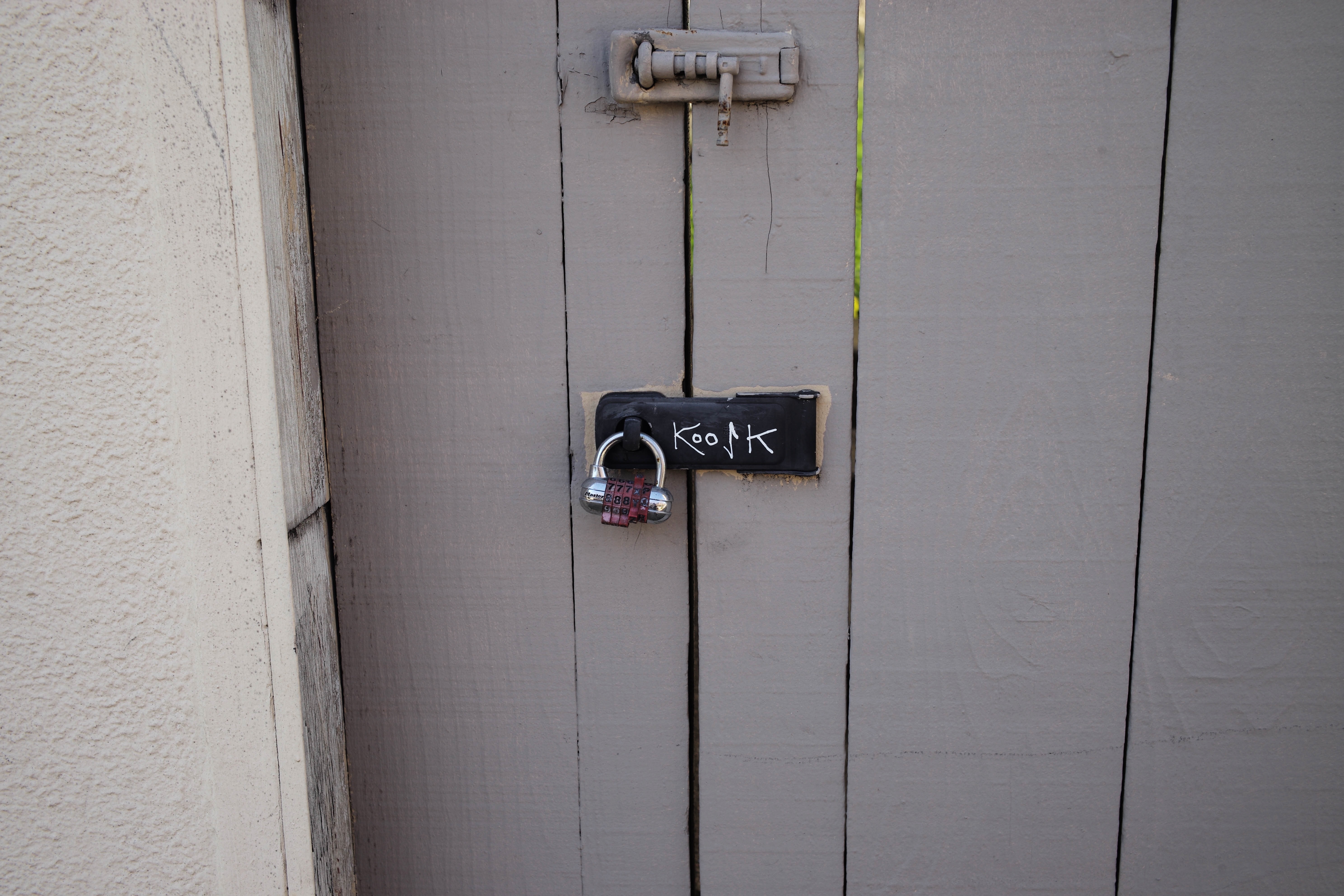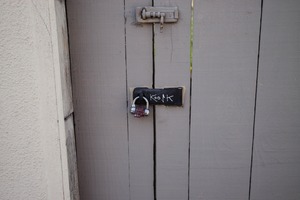 The photograph captures a weathered wooden gate adorned with a simple padlock, exuding a sense of mystery and quiet resilience. The muted gray tones and subtle textures create an atmosphere of solitude, while the playful handwriting on the lock adds an unexpected touch of character. This composition invites viewers to ponder what lies beyond, evoking curiosity and introspection.