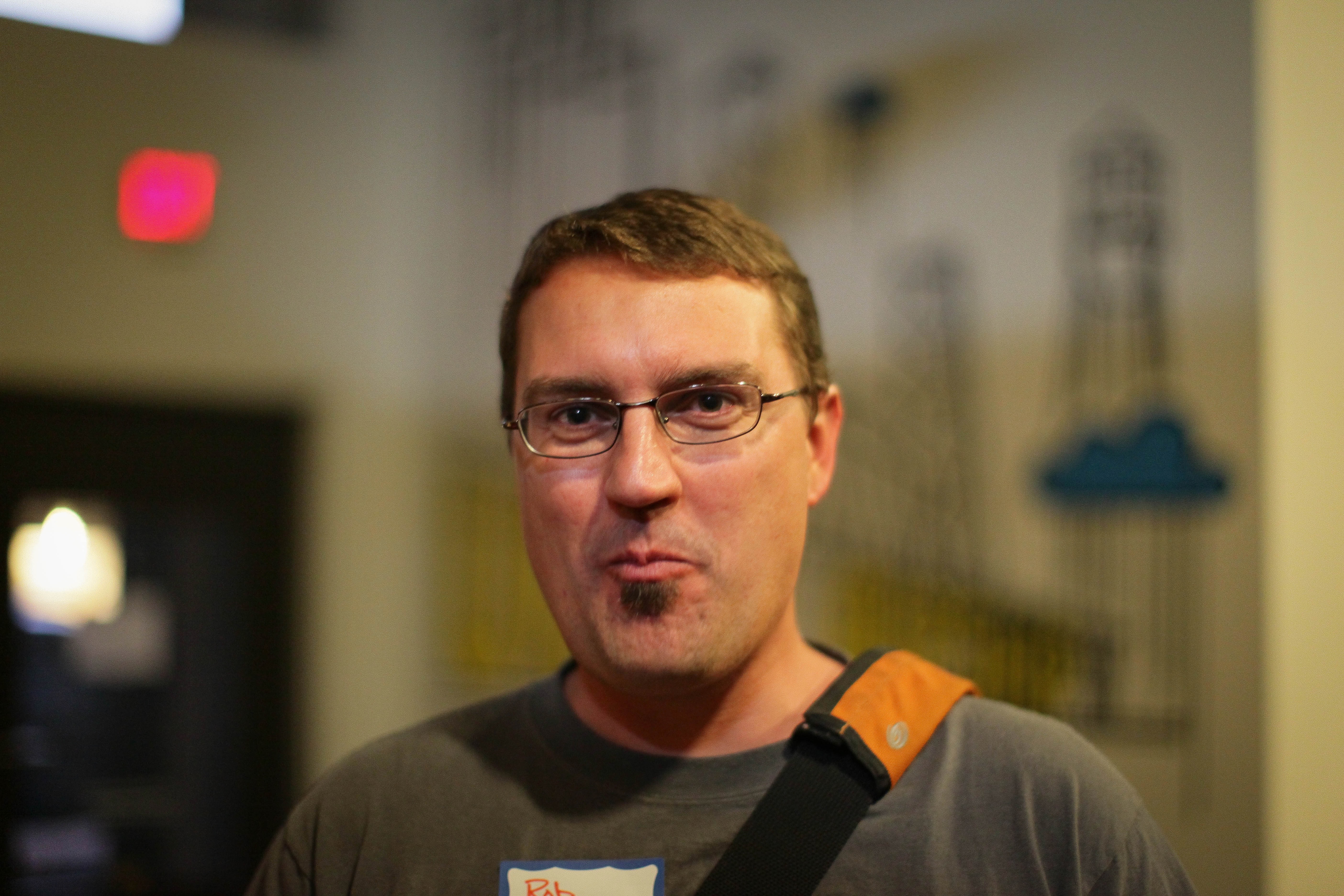 The photograph captures a man with a playful expression, standing in a softly lit environment. His slight smirk and the casualness of his attire suggest a relaxed atmosphere, while the blurred background features whimsical illustrations that add a touch of creativity. The warm tones and soft focus lend a friendly, inviting mood to the scene.