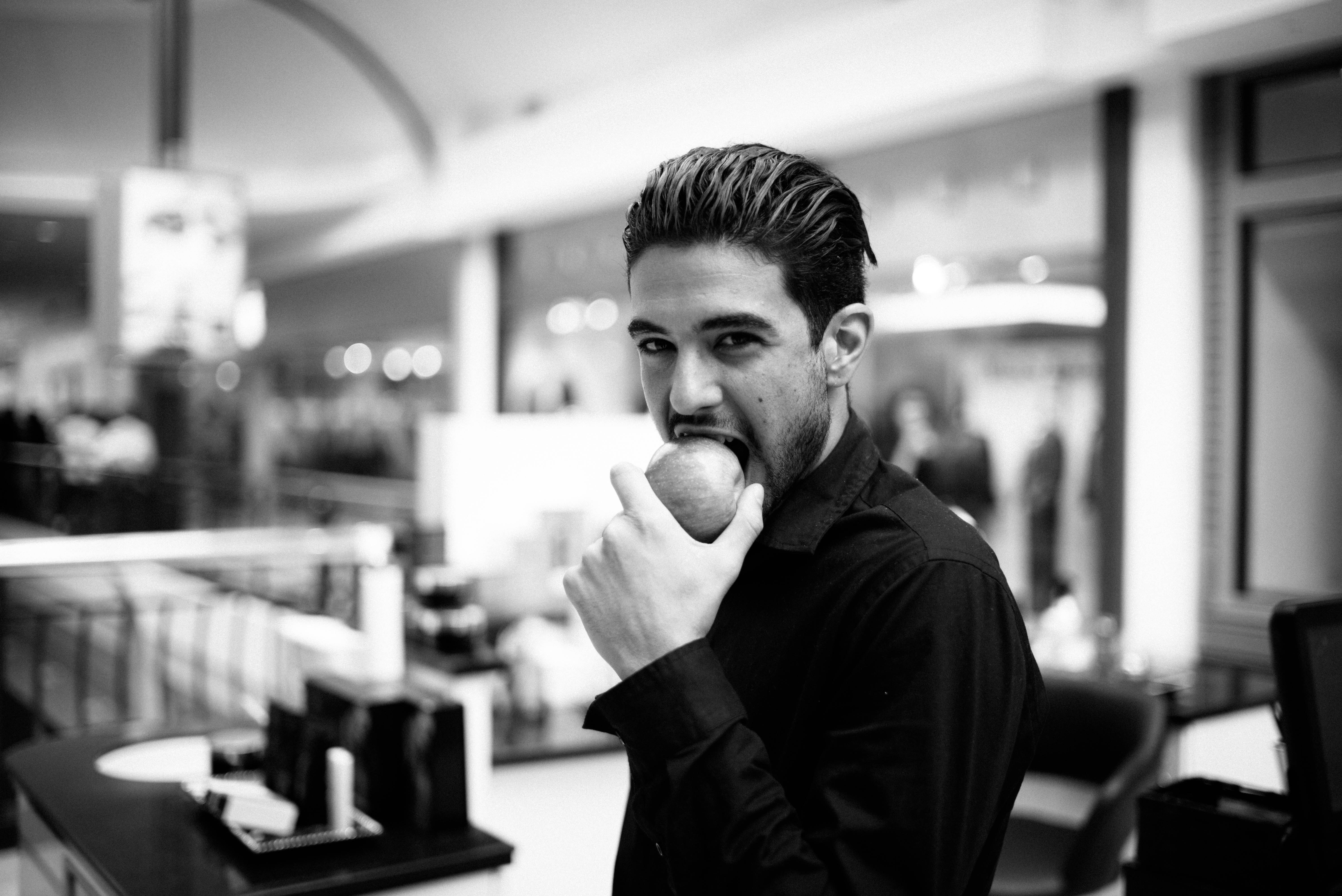 In this striking black-and-white photograph, a young man dressed in a dark shirt playfully bites into an apple, his intense gaze directed toward the viewer. The composition is dynamic, with blurred figures and soft lighting in the background that contrast with the sharp focus on the subject, creating an atmosphere of intrigue and allure. The overall mood evokes a sense of mischief and confidence, heightened by the juxtaposition of innocence and rebellion symbolized by the apple.