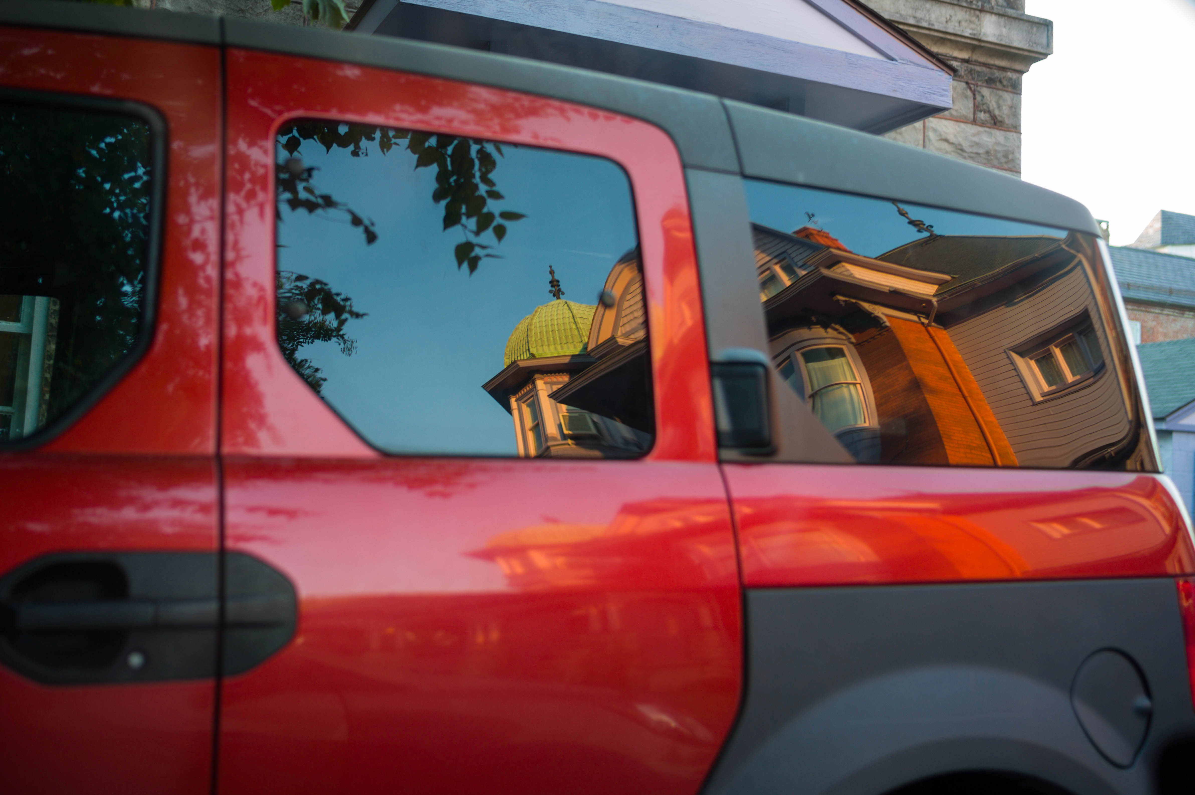A vibrant red vehicle stands in sharp contrast to the soft reflections of a historical building. The composition captures a moment of stillness, with the warm light casting gentle shadows and highlighting the intricate details of both the car and the architecture. This interplay of color and reflection creates an intriguing blend of the modern and the historic, evoking a sense of nostalgia amid urban life.