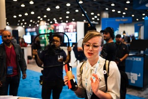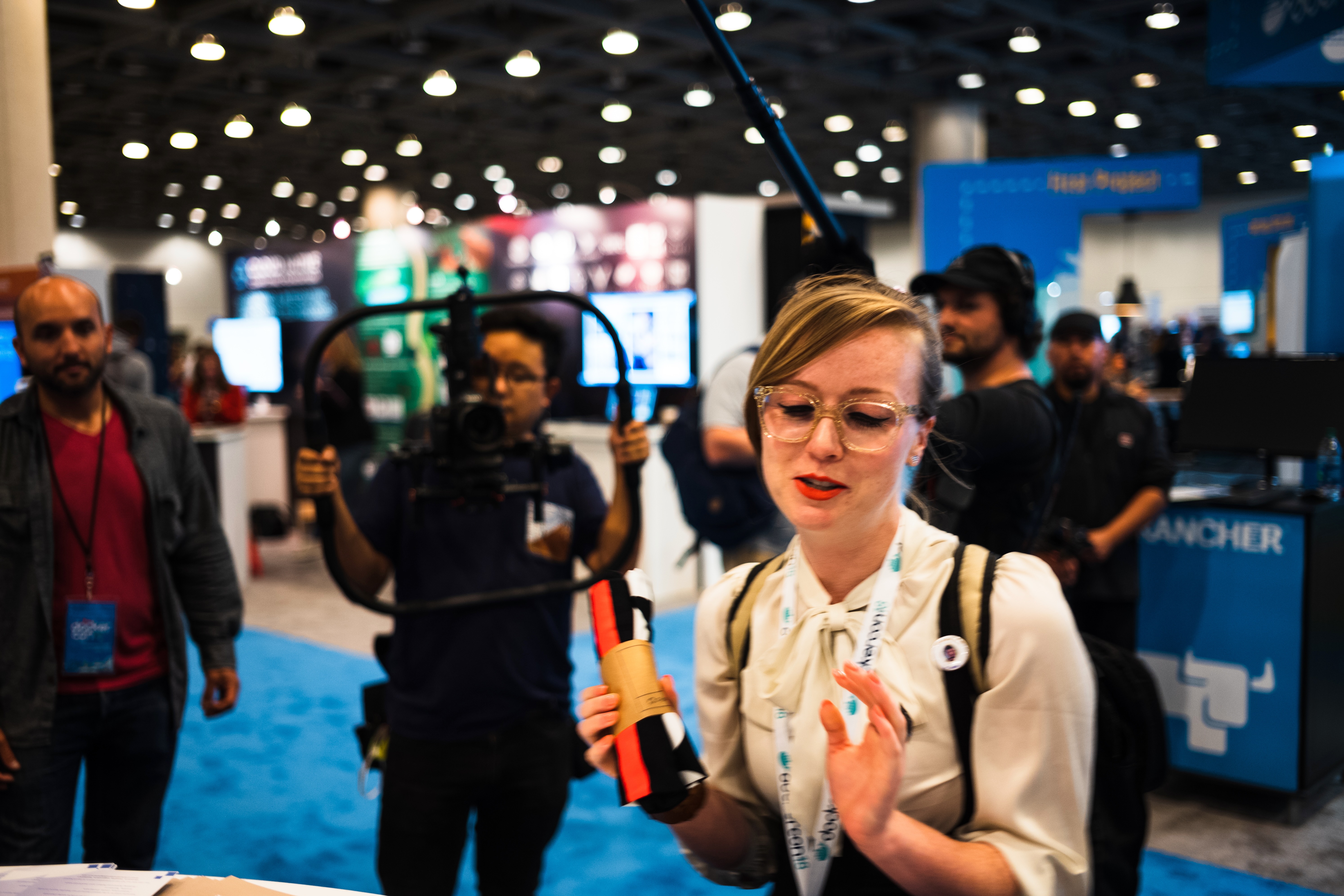 A young woman, dressed in a light blouse and sporting glasses, animatedly speaks while holding a rolled-up item, likely demonstrating or explaining something. The busy backdrop of blurred figures and colorful booths suggests a lively event atmosphere, with overhead lighting creating an ambient glow that highlights her enthusiasm amidst the surrounding activity.