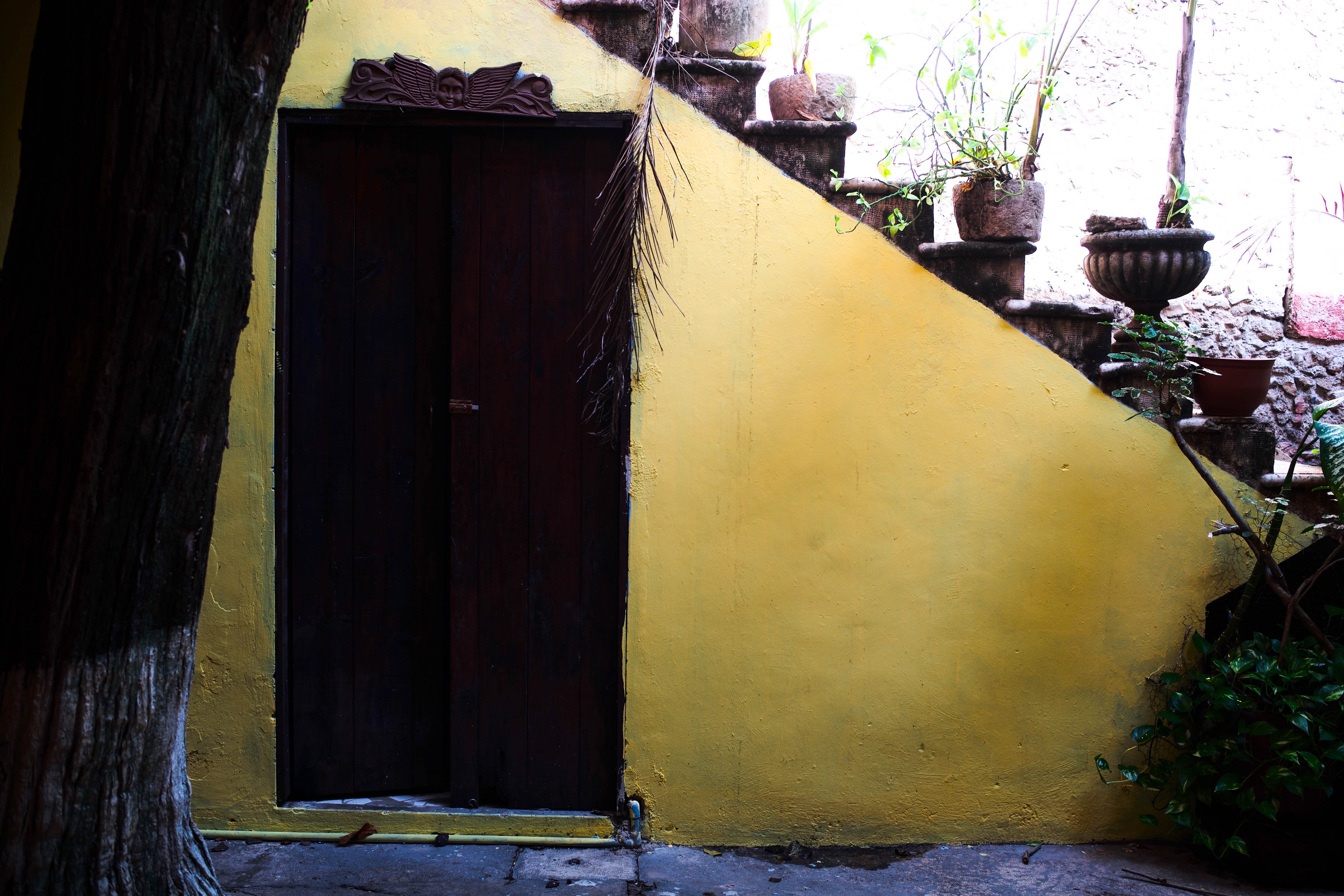 A weathered wooden door stands framed by a vibrant yellow wall, exuding a sense of quiet mystery. The soft light casts gentle shadows that dance across the uneven surface, highlighting the textured details of the scene. Potted plants creep up an adjacent stairway, adding a touch of life amidst the solitude, inviting curiosity about what lies beyond.