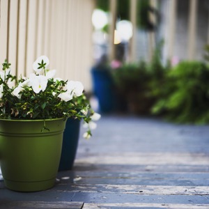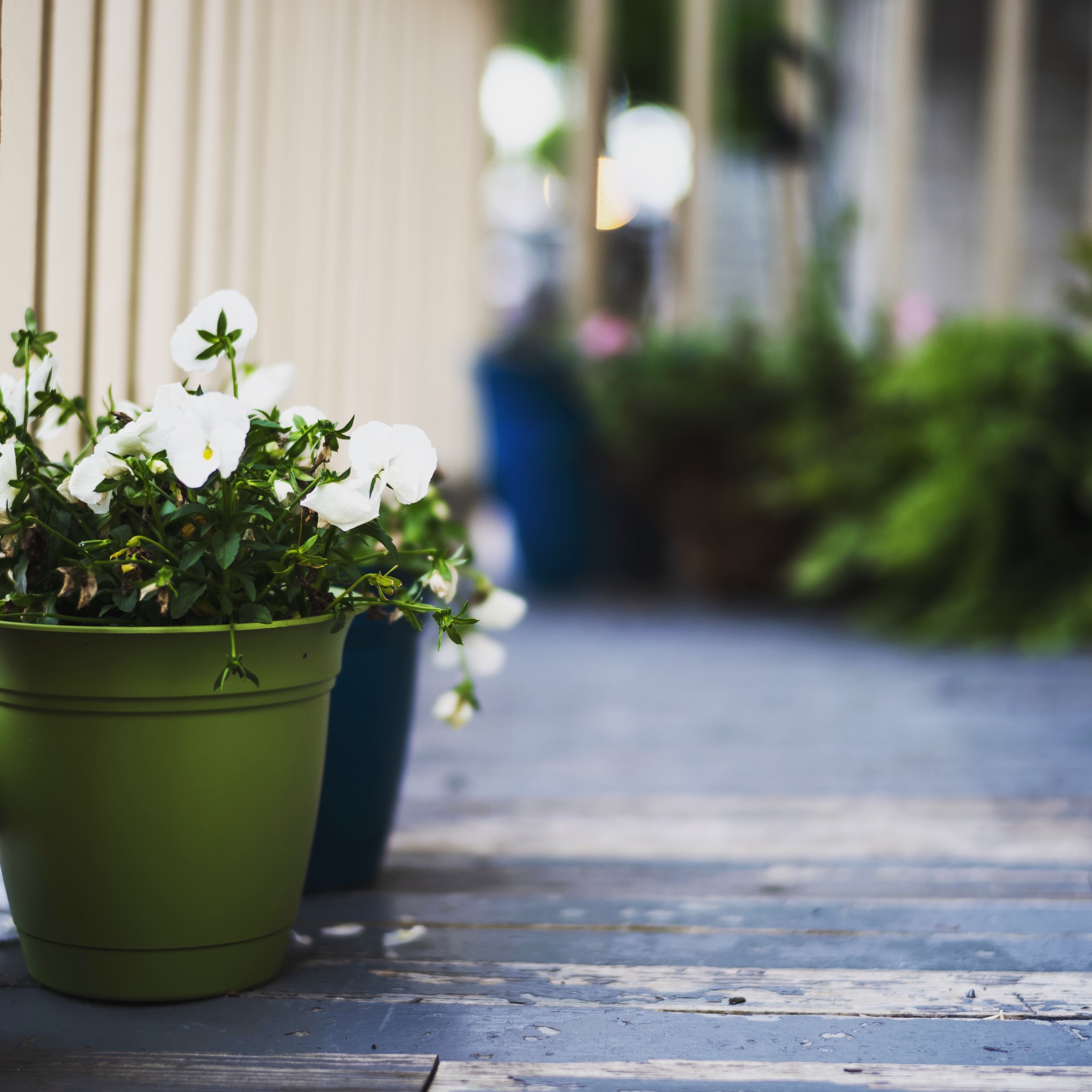 In this tranquil photograph, a vibrant green pot brims with delicate white flowers, capturing the essence of spring. The soft lighting bathes the scene, enhancing the peaceful mood as the bouquet stands prominently in the foreground against a blurred background of colorful pots and greenery. The wooden floor adds warmth and texture, inviting a sense of calm and connection to nature.