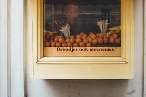 This photograph captures a quaint shop window filled with bright oranges and decorative straws, inviting passersby with a sense of warmth and homeliness. The soft, natural light enhances the golden hues of the fruit, creating a cheerful and inviting atmosphere. The text below adds a personal touch, suggesting that customers can take their fresh goods away, further enriching the shop's welcoming vibe.