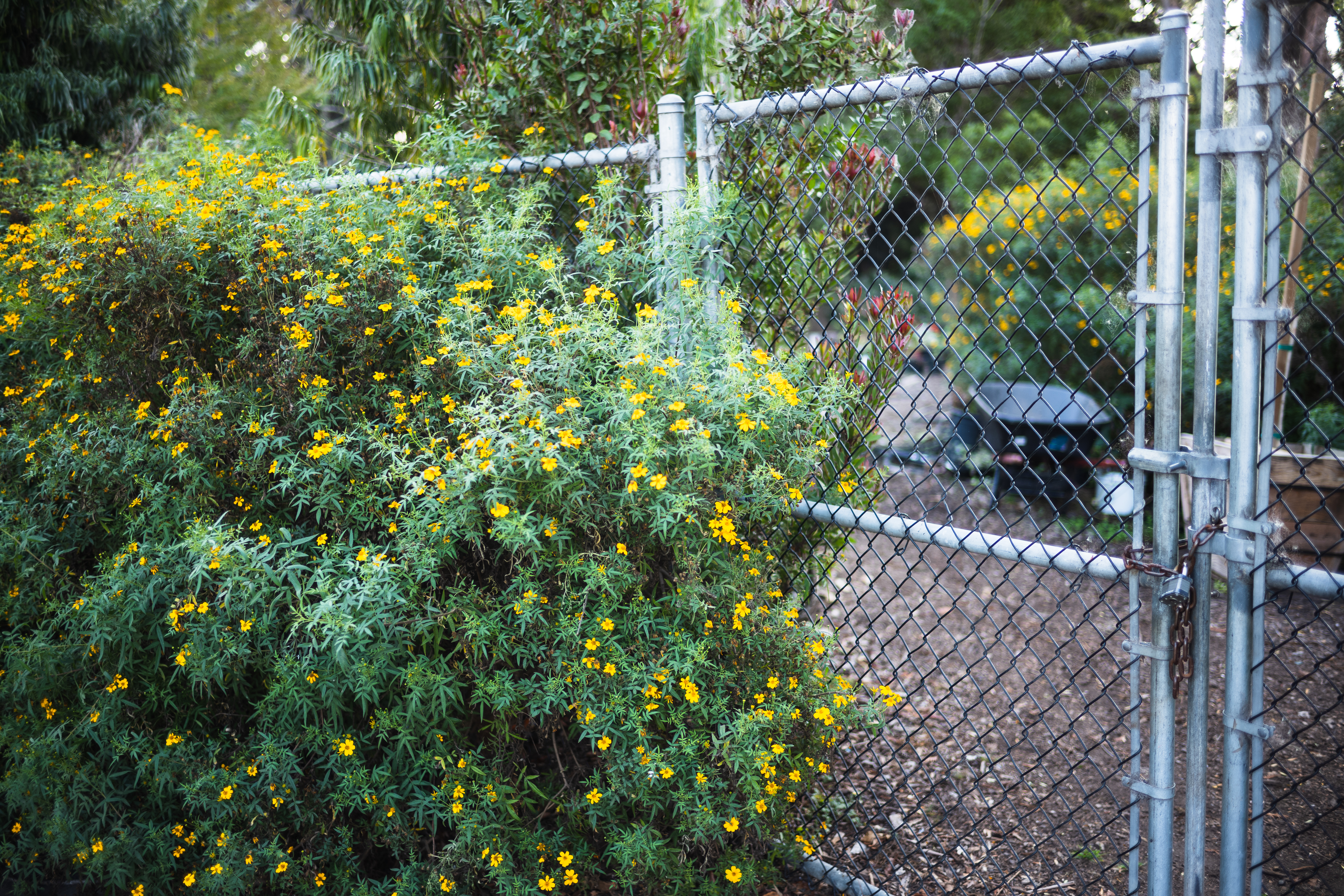 A vibrant tangle of yellow flowers spills over a weathered chain-link fence, creating a harmonious blend of industrial and natural elements. The soft, diffused lighting casts a gentle glow, highlighting the lush greenery and the cheerful blooms, evoking a sense of tranquility and hidden beauty. In the background, hints of more foliage and a shadowy cart suggest a deeper, unexplored garden beyond the gate, inviting curiosity.