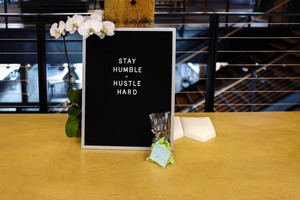 The photograph features a minimalistic workspace scene with a striking black letter board that reads "STAY HUMBLE - HUSTLE HARD," conveying a motivational message. A delicate orchid adds a touch of elegance, while a colorful treat sits nearby, enhancing the inviting atmosphere. The warm lighting and clean wooden surface create a cozy yet focused environment, perfect for productivity and reflection.