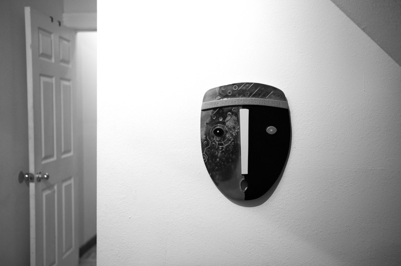 The photograph features a striking and abstract mask mounted on a plain white wall, exuding a sense of mystery and contemplation. The monochromatic palette enhances the mask’s intricate details while casting soft shadows that create a serene mood in the otherwise stark space. A doorway fades into the background, hinting at the possibilities beyond, while the mask emerges as the focal point, inviting viewers to ponder its story.
