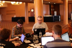 In a spacious venue, a group of individuals sits around a dark table, each engaged with their laptops in a collaborative atmosphere. The warm lighting casts a soft glow, creating a sense of focus and intimacy amidst the open space. Subtle tension encapsulates their concentration as they share ideas and work diligently, framed by the elegant architecture around them.