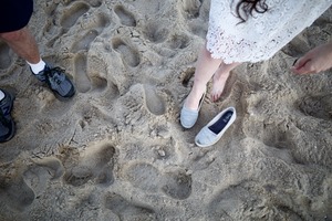This photograph captures two pairs of feet standing in the soft, textured sand of a beach, evoking a sense of casual intimacy. The warm, natural lighting highlights the delicate lace of a white dress and the contrasting textures of footwear. The scattered footprints in the sand add a narrative of exploration and momentary presence, enhancing the relaxed mood of a sunny day by the sea.