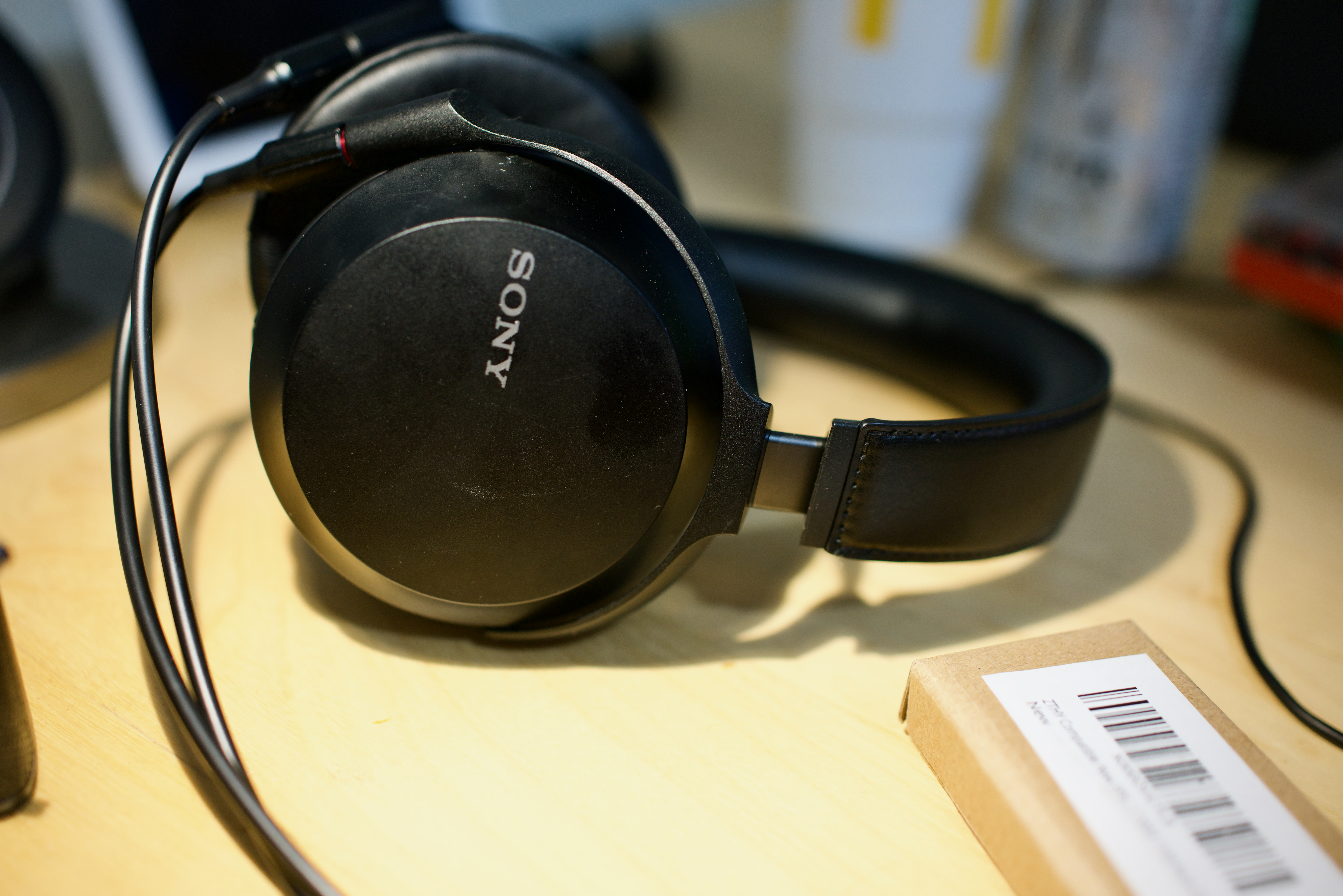 The photograph captures a pair of sleek black Sony headphones resting casually on a wooden surface, embodying a blend of elegance and functionality. Soft, diffused lighting accentuates the subtle textures of the headphones and the warm tones of the surface, creating an inviting mood that suggests a moment of relaxation and focus. The surrounding elements, slightly blurred, hint at a creative workspace, enhancing the overall sense of contemplation and auditory anticipation.