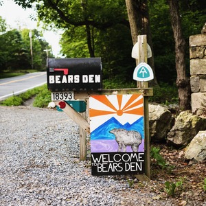 A rustic mailbox stands proudly at the entrance to 'Bears Den', adorned with a vibrant hand-painted sign. The warm, cheerful colors evoke a sense of welcome against the lush greenery, while the soft morning light casts gentle shadows, enhancing the serene atmosphere of this nature retreat. The composition invites curiosity, blending artistic charm with a hint of adventure in the woods.