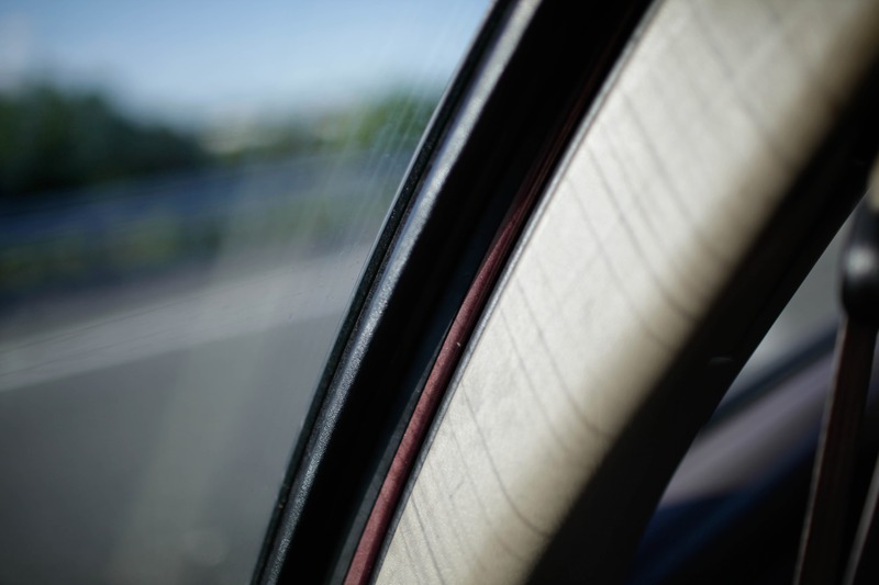 This intimate photograph captures the subtle interplay of light and texture along the edges of a car window. The smooth lines and soft shadows create a serene mood, suggesting a moment of quiet reflection during a journey. The blurred scenery beyond hints at movement and adventure, contrasting the stillness of the interior.