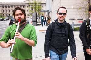 The photograph captures a lively street scene featuring two friends walking side by side, one playing a flute while the other smiles brightly, exuding a cheerful camaraderie. The urban backdrop, softened by natural light filtering through overcast skies, adds depth and context, highlighting the juxtaposition of music and daily life. This moment, filled with a sense of spontaneity and connection, embodies the joy of companionship amidst the hustle of the city.