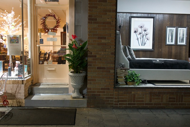 The photograph captures a cozy storefront, illuminated warmly against the night. On the left, a welcoming entrance adorned with a wreath and a glowing tree creates an inviting atmosphere, while the adjacent window showcases a beautifully styled bedroom, exuding comfort and elegance. The contrast between the soft interior lighting and the more subdued exterior setting evokes a sense of tranquility and charm.