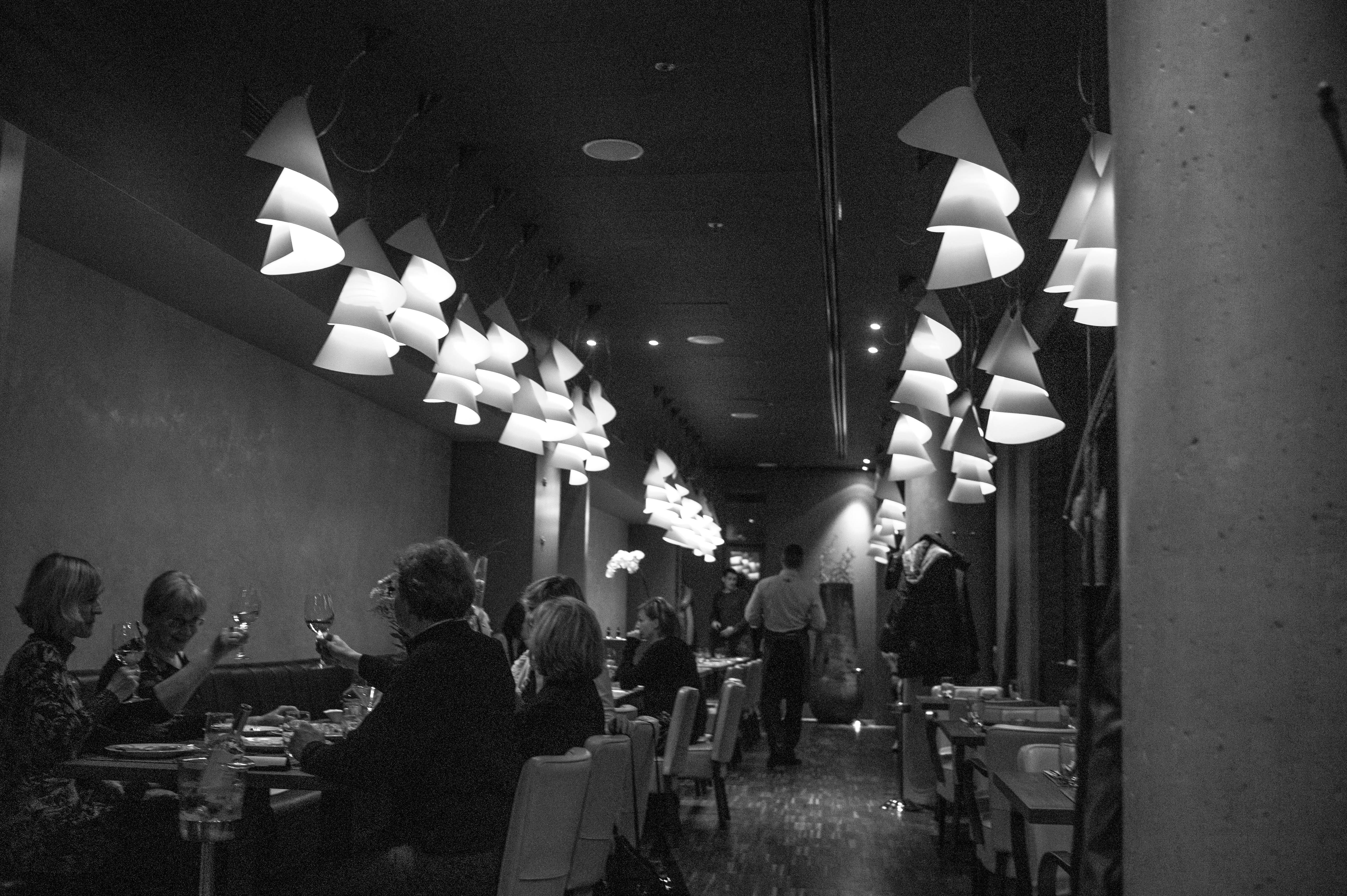 In a dimly lit restaurant, patrons engage in quiet conversation beneath modern pendant lights. The contrast of shadows and warm tones evokes a sense of intimacy and relaxation, while the rhythmic arrangement of tables leads the eye down the elongated space. The monochrome effect enhances the mood, creating a timeless ambiance filled with warmth and connection.