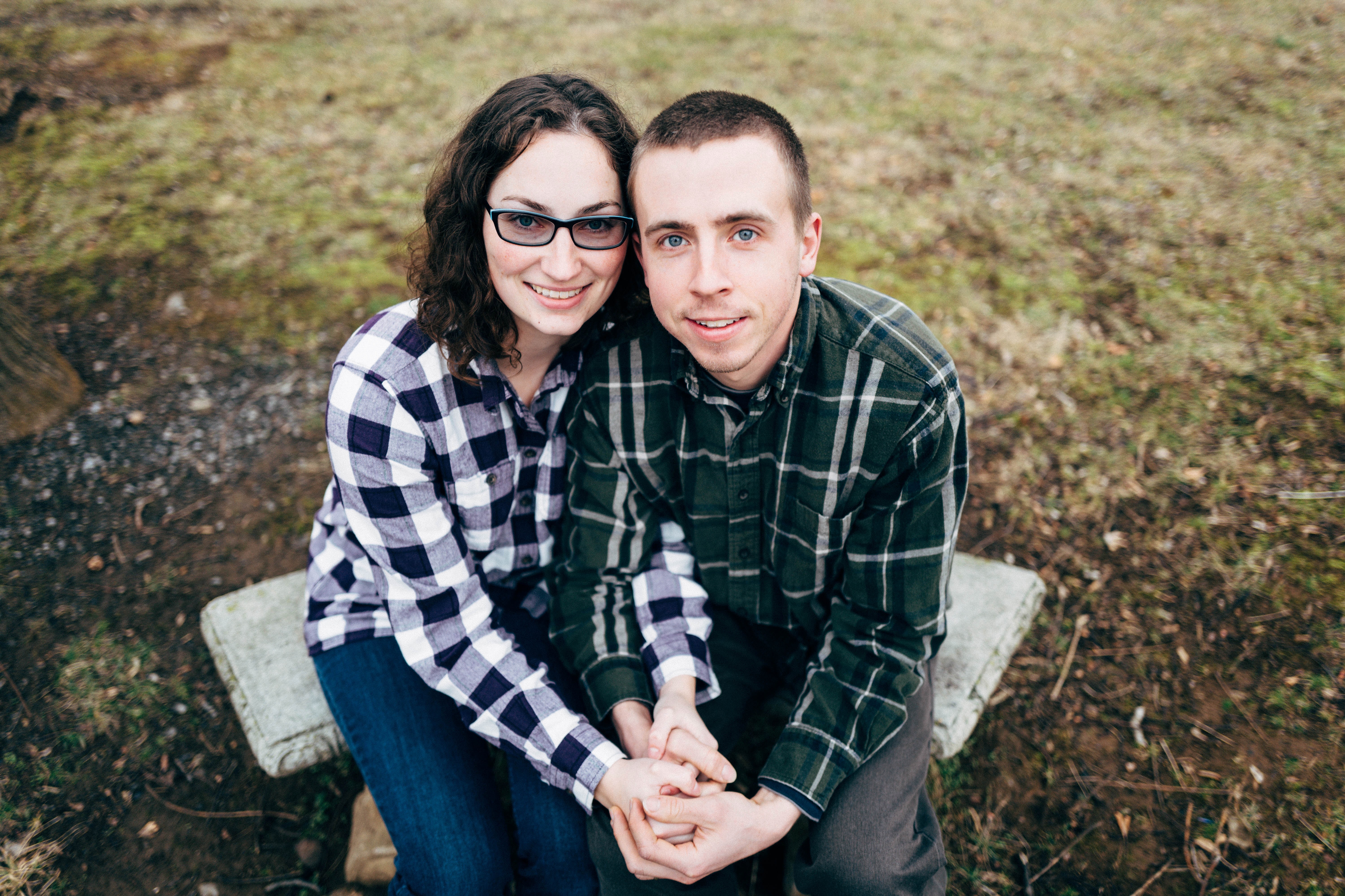 The photograph captures a couple sitting closely on a stone bench in a natural setting, hands intertwined, exuding warmth and intimacy. Their matching plaid shirts create a harmonious blend with the earthy tones of the background, while the soft lighting enhances the inviting atmosphere. The relaxed expressions on their faces convey a sense of comfort and togetherness.