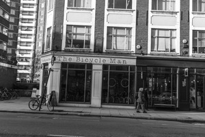 The photograph captures a quaint bicycle shop named 'The Bicycle Man' nestled between modern apartment buildings. A couple strolls leisurely past, embodying a sense of nostalgia in this black-and-white scene, enhanced by soft lighting that casts gentle shadows. The composition juxtaposes the bustling urban life against a local, cozy atmosphere, inviting a moment of reflection in an otherwise busy city.